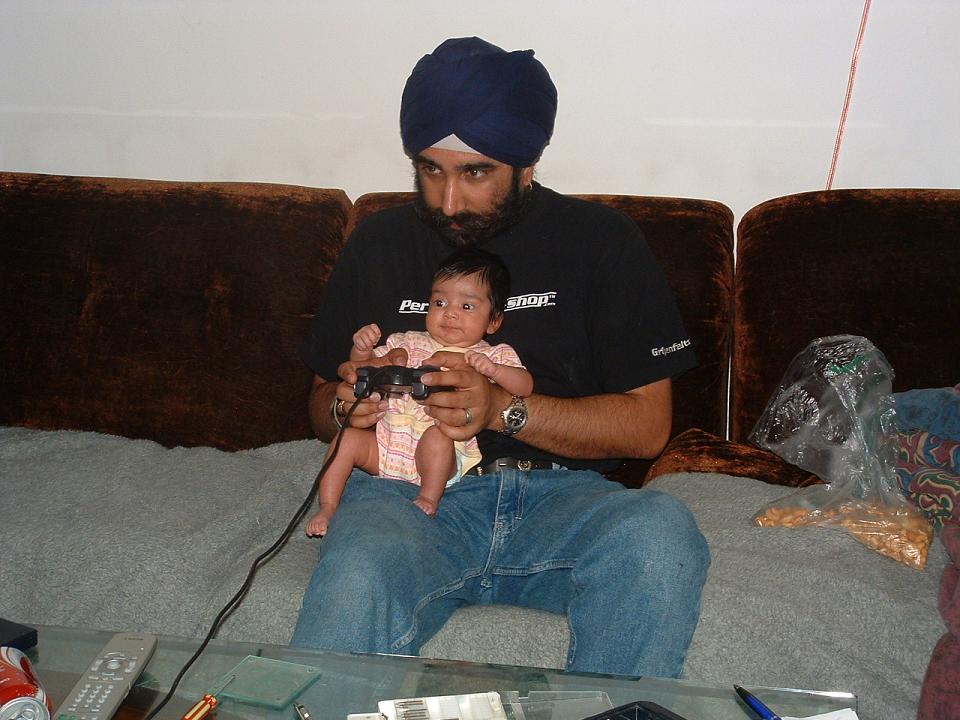 3 weeks old and learning how to play Need 4 Speed Hot Pursuit II from daddy.